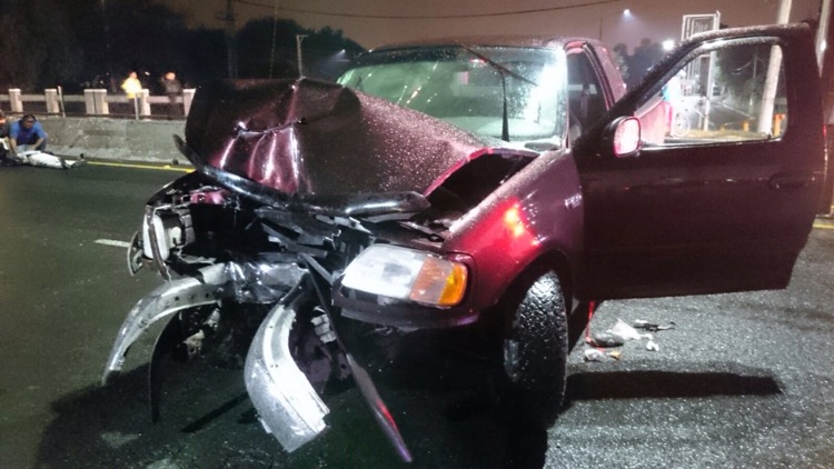 La camioneta en que circulaban golpeó de lleno contra la base de una señal vial, por lo que pese al gran tamaño del vehículo este quedó deshecho del frente.