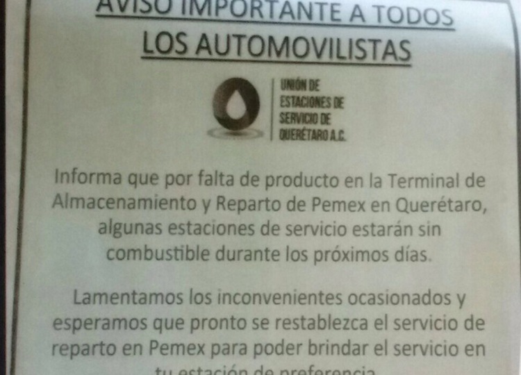 Representantes de la Asociación de Gasolineros del Estado de Querétaro, advirtieron sobre el desabasto de combustible diésel debido a la falta de abastecimiento por parte de Petróleos Mexicanos, situación que afectara los tanques de almacenamiento en Querétaro.Actualmente no se ha presentado un abasto de forma regular y algunas estaciones de servicio han resultado afectadas.