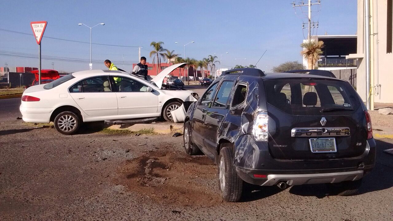 El choque entre un automóvil Peugeot y una camioneta Honda resultó en la volcadura de ésta luego de que ninguno de los dos permitió que el otro pasara primero, en la glorieta de Villas del Mesón y Bulevar de las ciencias, en Juriquilla.