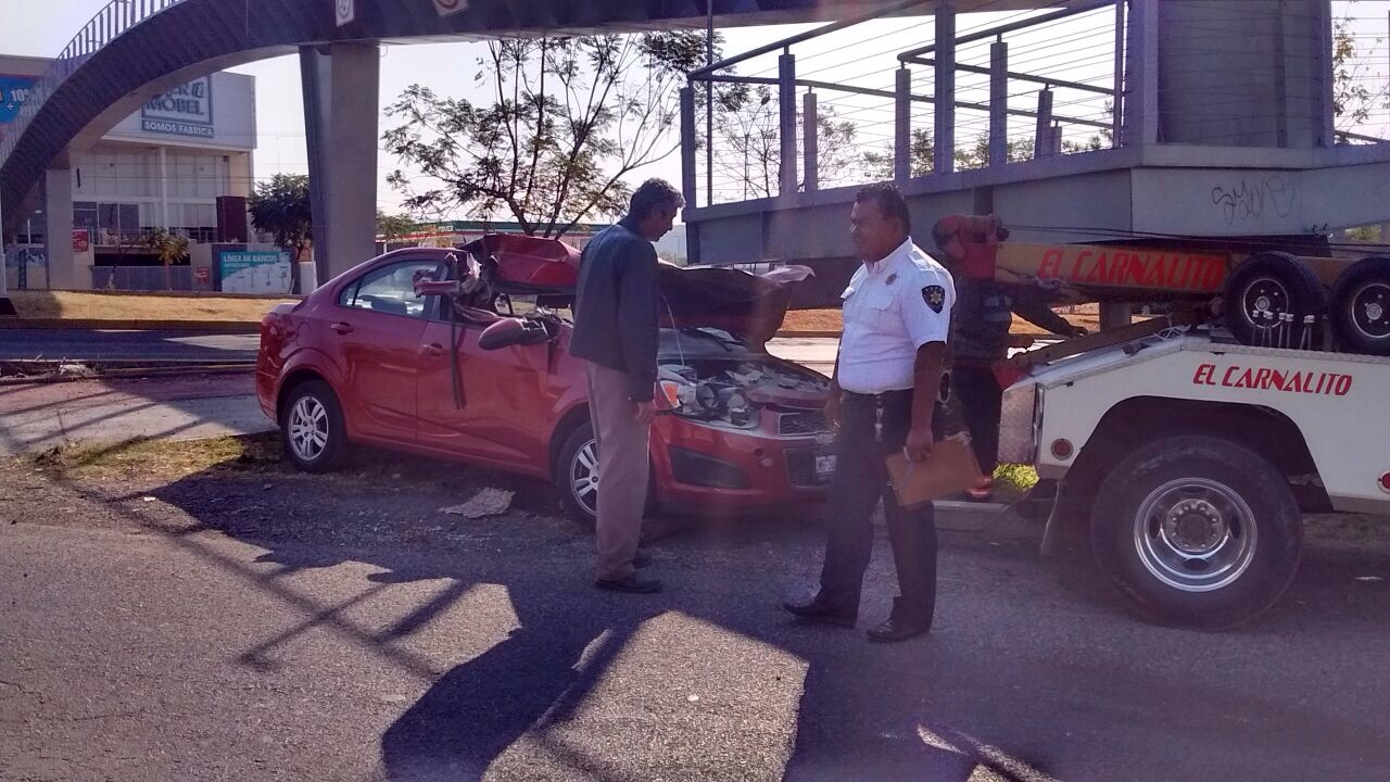 Los tripulantes de un automóvil Sedán resultaron ilesos luego de incrustar su vehículo en la base de un puente peatonal, en el Paseo de la república, en las cercanías de Juriquilla.