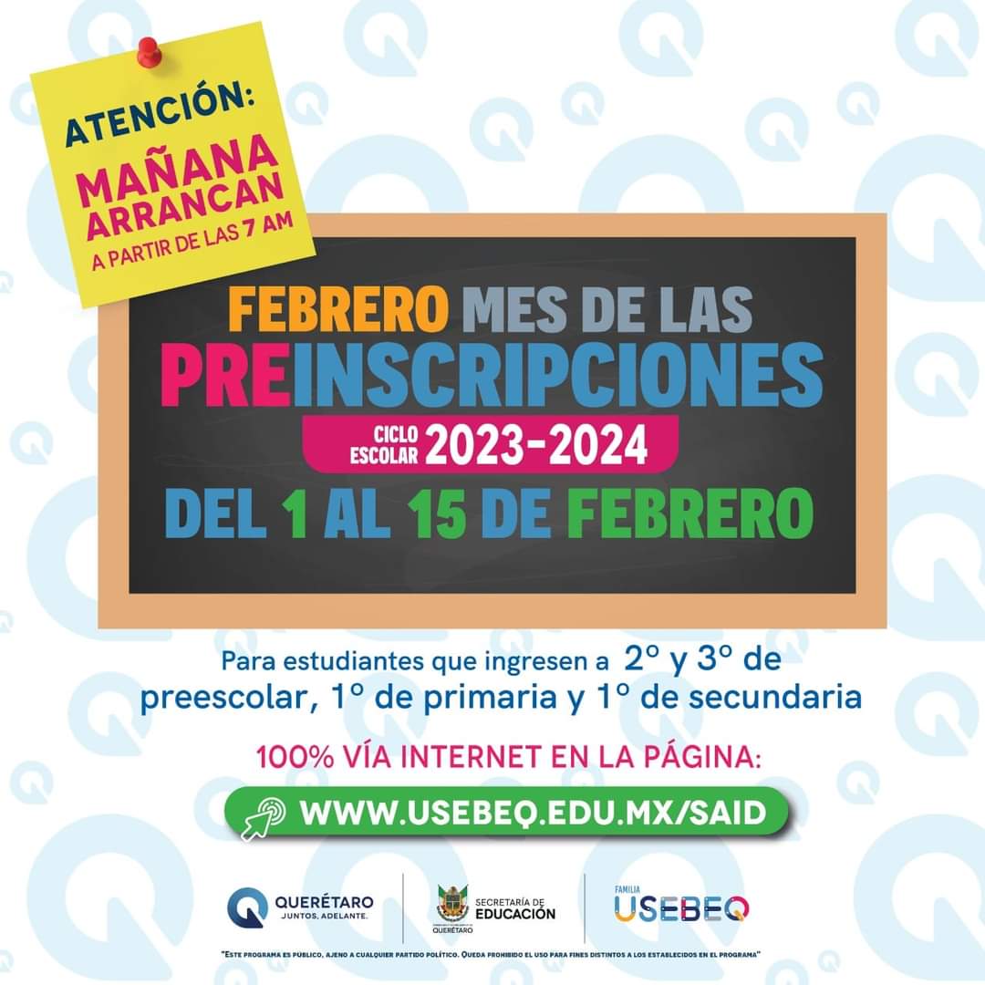 La Unidad de Servicios para la Educación Básica en el Estado de Querétaro (USEBEQ) anunció la extensión del periodo de preinscripciones hasta el domingo 16 de febrero a las 12 de la noche, con el objetivo de asegurar un lugar para las y los estudiantes en el ciclo escolar 2025-2026. Las madres, padres de familia o tutores podrán realizar el trámite para segundo y tercero de preescolar, primero de primaria y primero de secundaria en una escuela pública a través del portal oficial: www.usebeq.edu.mx/said, registrando la CURP del menor. Este…