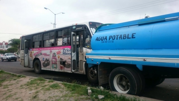 Encontronazo entre un camión de pasajeros y una pipa estacionada dejó daños materiales importantes, además de al menos cinco de pasajeros con algunos golpes menores.