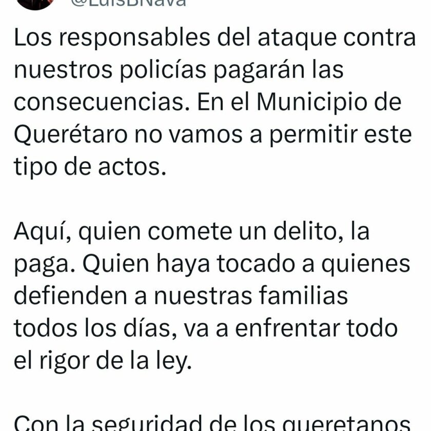 A través de sus redes sociales, Luis Bernardo Nava, presidente municipal de Querétaro, expresó su enérgica condena ante el trágico asesinato de dos policías municipales quiénes perdieron la vida acribillados a balazos mientras resguardaban un inmueble en la colonia Lomas de Casa Blanco.