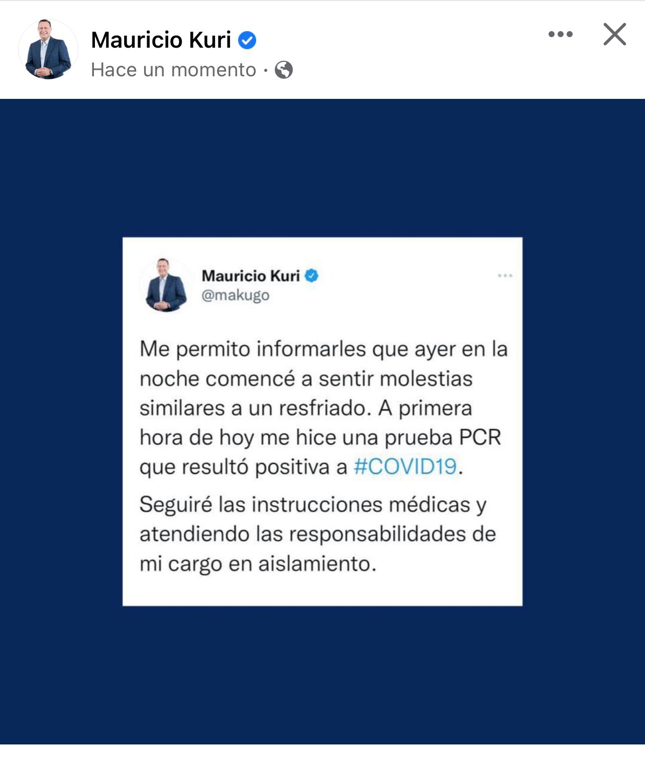 “Me permito informarles que ayer en la noche comencé a sentir molestias similares a un resfriado. A primera hora de hoy me hice una prueba PCR que resultó positiva a #COVID19” informó en su cuenta de Twitter.