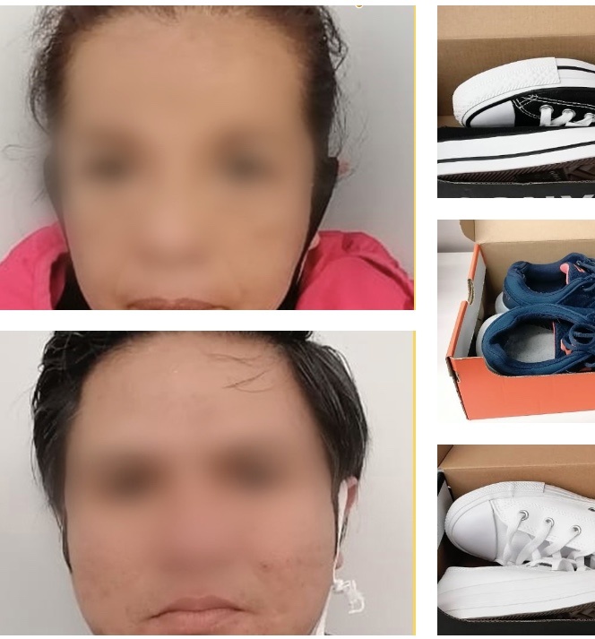 En el lugar, personal de seguridad privada notificó a los oficiales que visualizó que el sujeto quitaba los sensores a un par de tenis y los sustituía por los que traía puestos, y la mujer ocultaba dentro de su bolso dos pares más.