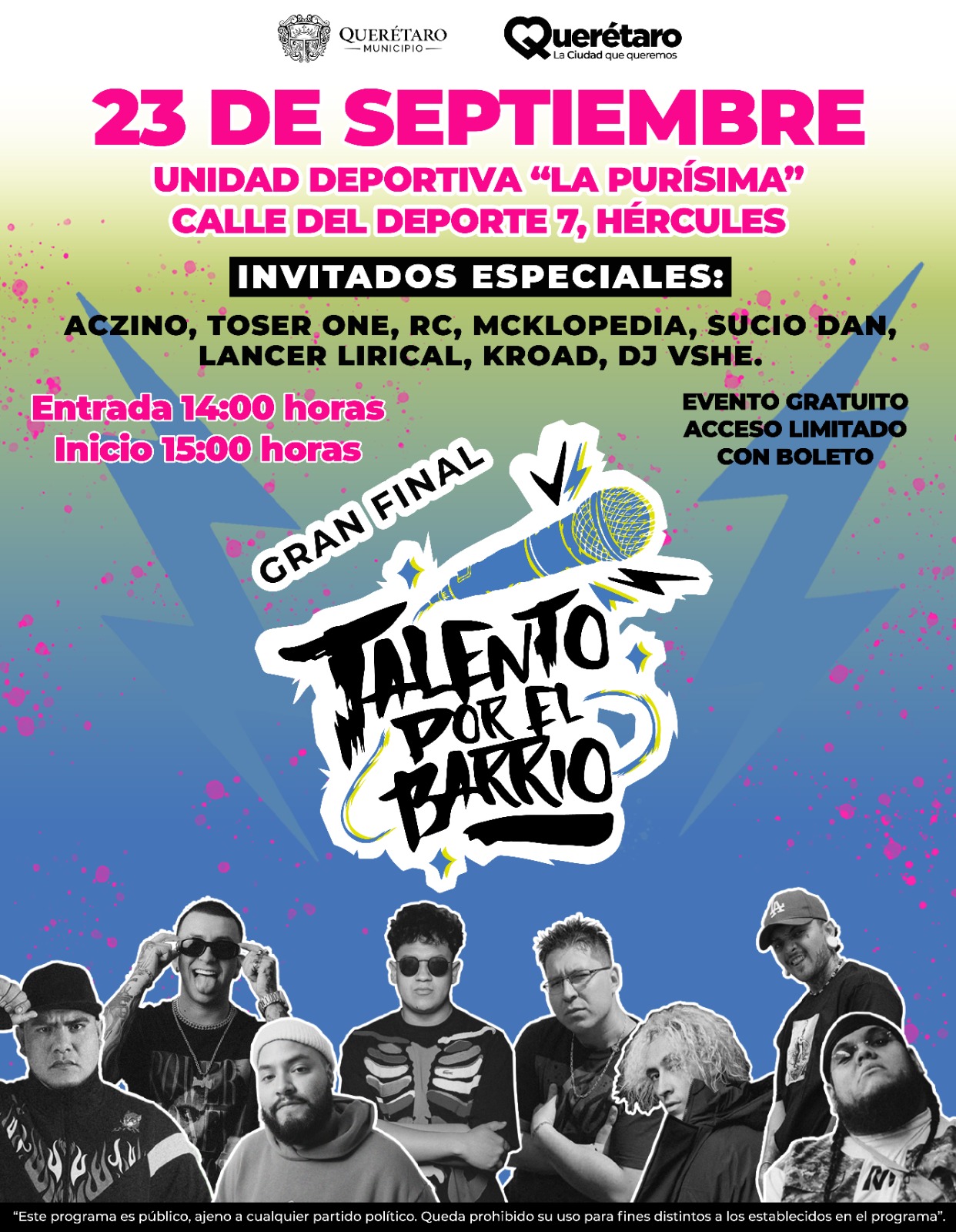 Este próximo 23 de septiembre, la emoción y el talento se unirán en la Unidad Deportiva la Purísima de Querétaro para la gran final del programa “Talento por el Barrio”.