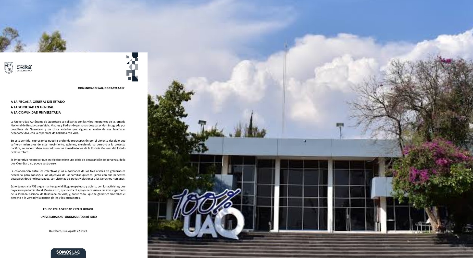 La Universidad Autónoma de Querétaro (UAQ) se solidarizó con las y los integrantes de la jornada Nacional de Búsqueda en Vida ; Madres y Padres de personas desaparecidas integrada por colectivos de Querétaro y de otros estados que siguen el rastro de sus familiares desaparecidos con la esperanza de hallarlos con vida