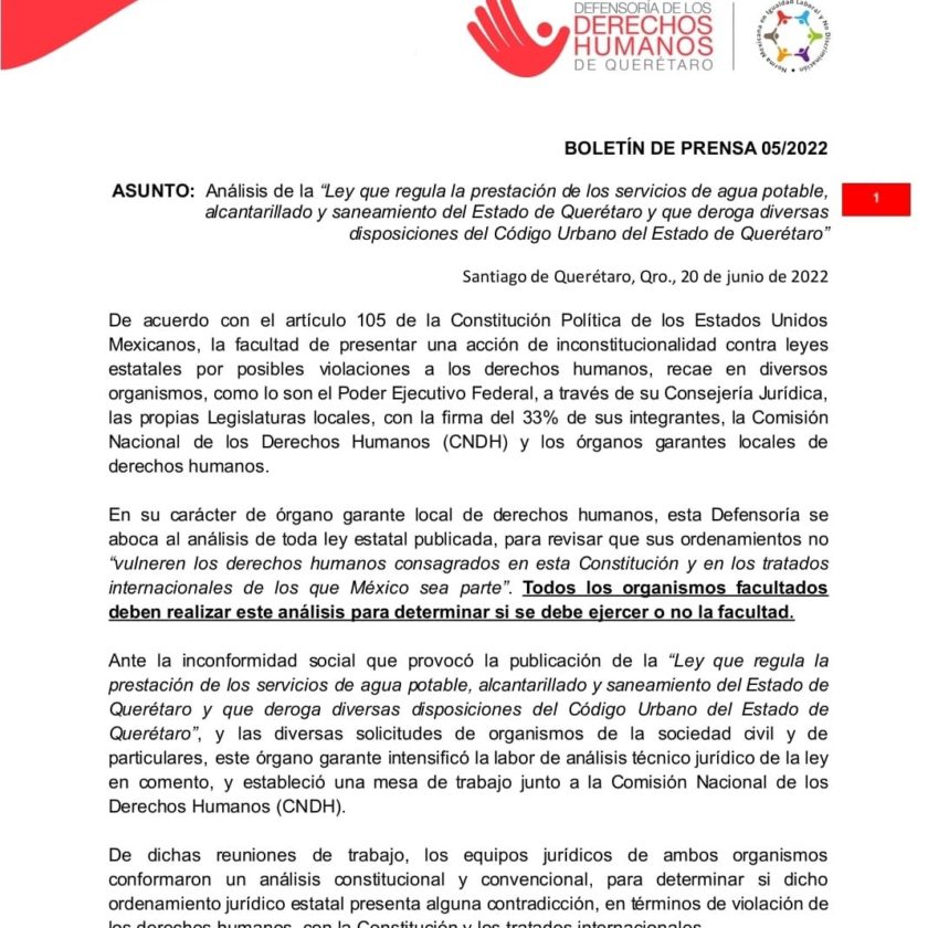 Señalaba que ante la inconformidad social que provocó la publicación de la “Ley que regula la prestación de los servicios de agua potable, alcantarillado y saneamiento del Estado de Querétaro y que deroga diversas disposiciones del Código Urbano del Estado de Querétaro”, y las diversas solicitudes de organismos de la sociedad civil y de particulares, este órgano garante intensificó la labor de análisis técnico jurídico de la ley en comento, y estableció una mesa de trabajo junto a la Comisión Nacional de los Derechos Humanos (CNDH).