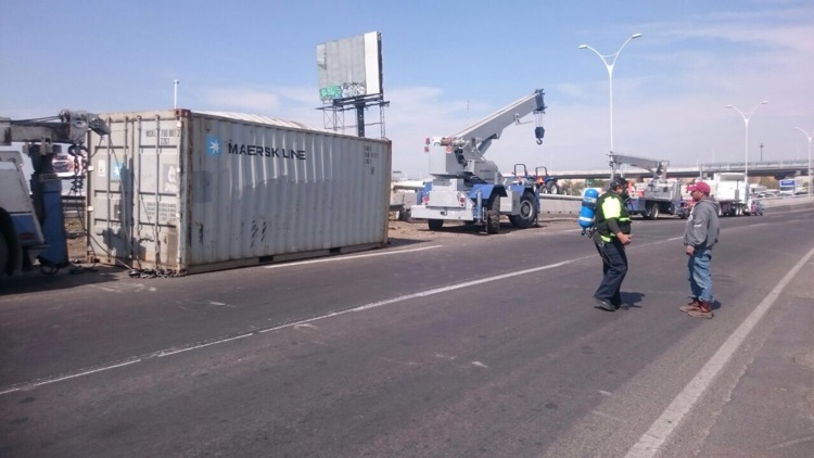 Un contenedor volcado provocó intensa movilización policíaca y de emergencistas luego de que los elementos de la Policía Estatal indicaron que notaron que había un olor a químico en el ambiente.
