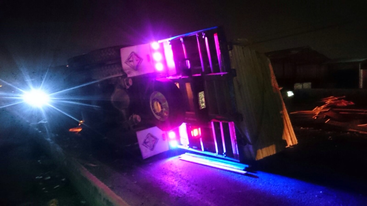 Debido a que parte de la madera que transportaba quedó esparcida en el pavimento, la circulación quedó obstruida en su totalidad por espacio de hora y media.