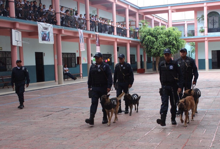 Personal de la Secretaría de Seguridad Pública y Tránsito Municipal de El Marqués, a través de la Coordinación de Prevención del Delito, realizo una Exhibición Canina con el Grupo K-9, en el Colegio J. Guadalupe Velásquez de la ciudad de Querétaro.