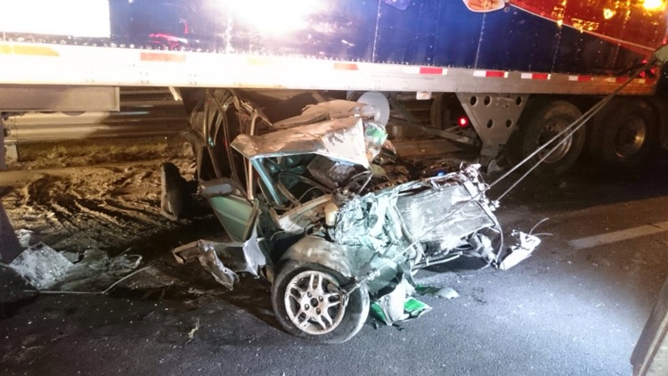 El incidente ocurrió en dirección a San Luis Potosí y se desconocen las causas, pero un automóvil compacto se metió de lleno debajo de la carrocería de uno de los remolques de un tráiler.