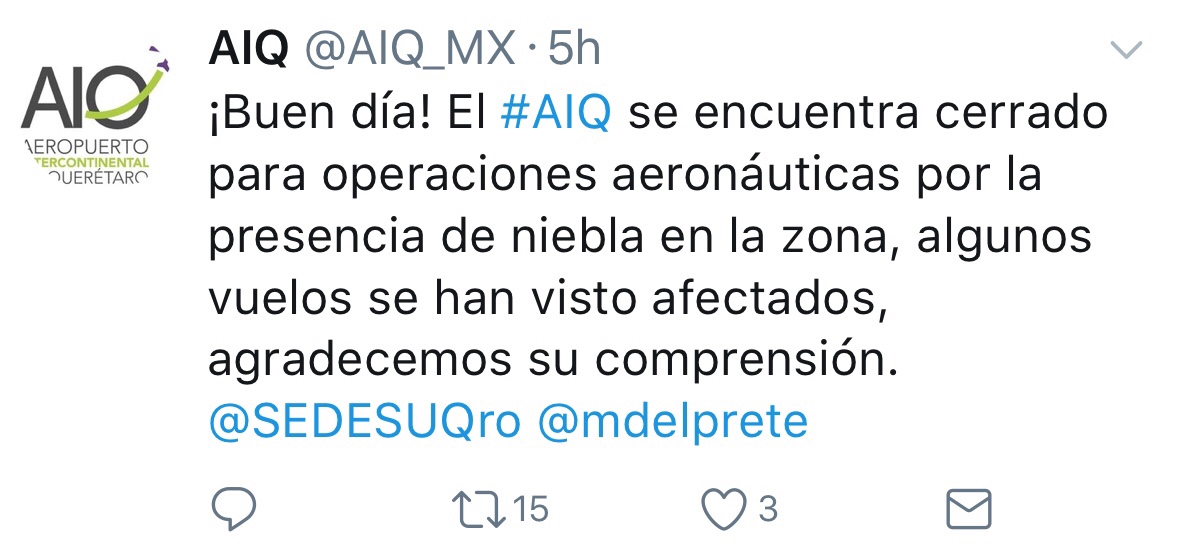 Se afectó una salida que se tenía programada desde el aeropuerto de Querétaro a Torreón, ya que la pista estaba invadida por el banco de neblina, que afectaba la visibilidad.