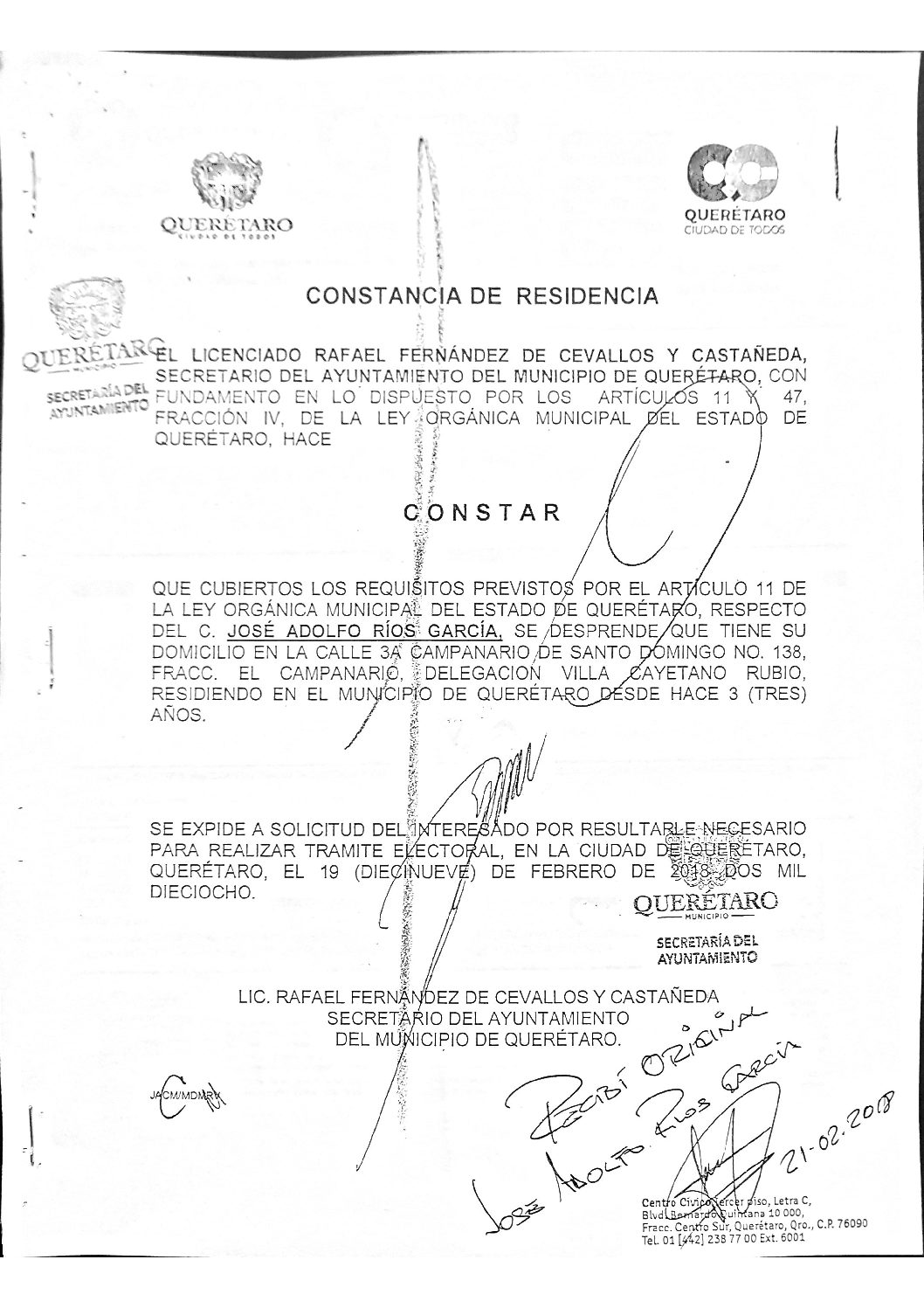 Recordemos que en la elección del 2015, Adolfo Ríos acudió a emitir su voto en el Municipio del Marqués por lo que resulta incongruente esta acción con la constancia de residencia emitida por el Municipio de Querétaro, toda vez que a la fecha no han transcurrido los 3 años a la fecha de expedición de la misma constancia ni tampoco la residencia que pretende el Sr. Adolfo Ríos.