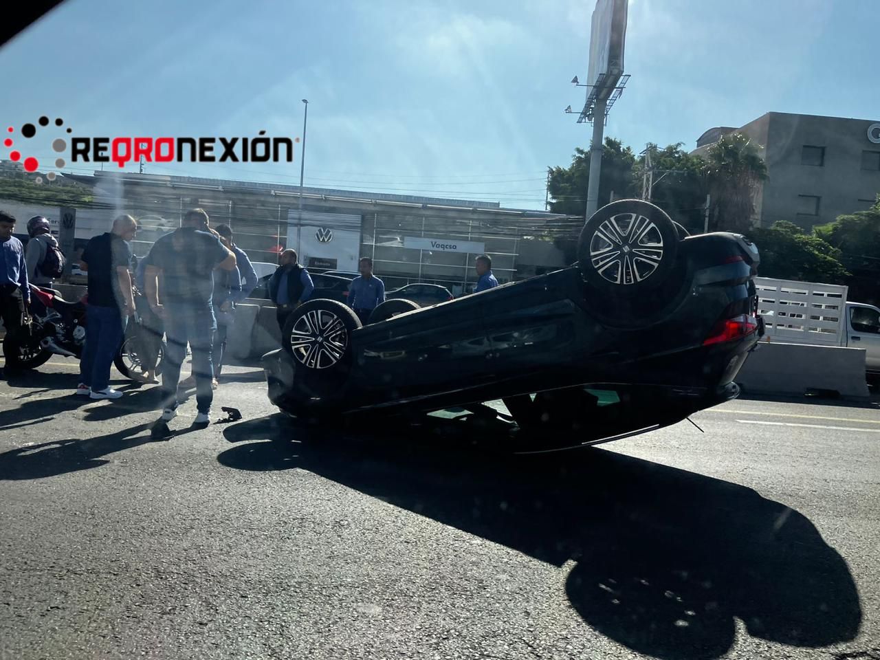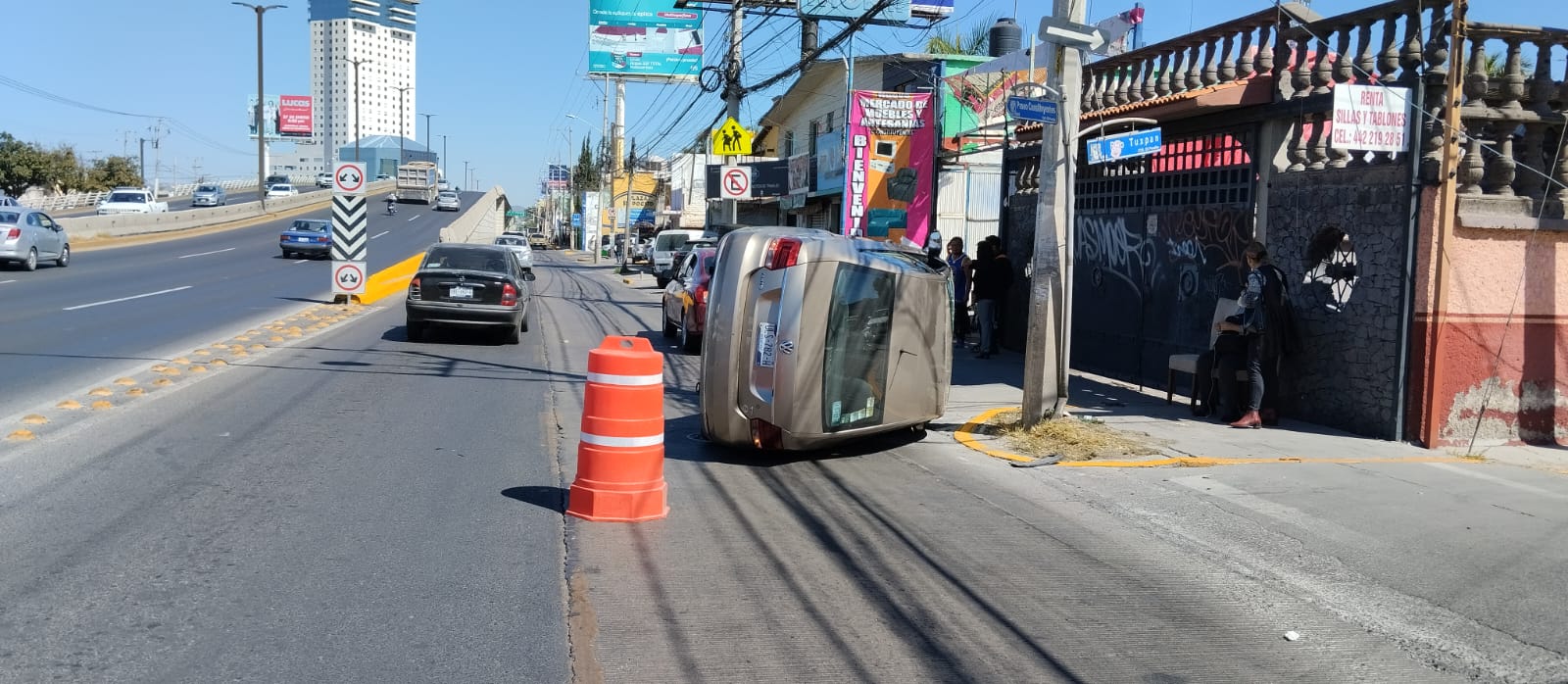 Un automovilista volcó sobre Bernardo Quintana frente al parque Querétaro 2000 rumbo a 5 fe febrero, luego de chocar contra otro vehículo. Al lugar arribaron paramédicos quienes atendieron al conductor del vehículo volcado a quien trasladaron al hospital. Policías municipales de Querétaro limitaron la zona para evitar algún accidente vial y controlar el tráfico, así también con apoyo de grúa retiraron el vehículo de la vialidad.