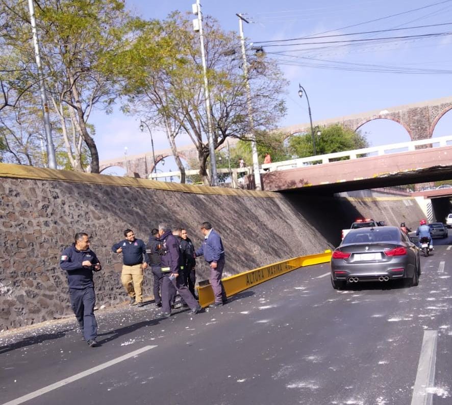 Fuerte accidente se registró en el puente vehicular de Bernardo Quintana a la altura de Centro Cívico, donde se vio involucrado una camioneta. Se presume que el exceso de velocidad provocó que el conductor de la unidad afectada se impactará contra el muro divisorio, provocando que saliera proyectada. Fue necesario cerrar la vialidad en ambos sentidos para poder acomodar los bloques de concreto, no se reportan personas lesionadas Este incidente provocó un intenso tráfico, ya que todos los vehículos tuvieron que circular en carriles laterales.