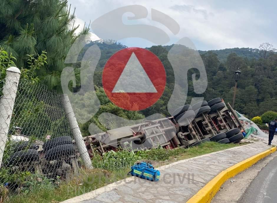 Vuelca camión de volteo en Pinal de Amoles, tras falla mecánica