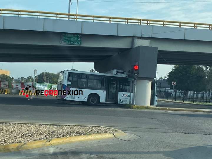 Durante la mañana de este martes un conductor del camión Qrobus intentó pasar por debajo del puente vial del Boulevard de Las Americas ubicado a la altura de la Plaza de Toros, justamente por el centro de la estructura, quedando atorado en su totalidad. Los pasajeros tuvieron que descender ya que el camion tuvo que ser jalado con grúa para retirarlo del lugar. Se espera que la estructura del Puente no haya sufrido daños severos. Al lugar arribaron elementos de la Agencia Estatal de Movilidad, y tránsito municipal.
