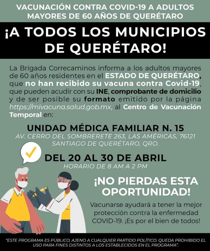 La delegación estatal de la Secretaria de Bienestar informó que los adultos mayores de 60 años residentes en el estado que no han recibido su vacuna contra la COVID-19, que pueden acudir con su INE, comprobante de domicilio y de ser posible su formato de registro al Centro de Vacunación Temporal con el fin de recibir su vacuna. Este espacio fue habilitado en la Unidad Médica Familiar 15 en Avenida del Sombrerete 263, Las Américas, en el municipio de Querétaro. Los adultos mayores podrán asistir desde este 20 al 30…
