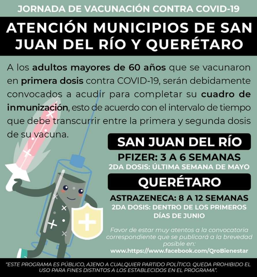 Este miércoles arranca la aplicación de segundas dosis de la vacuna contra la COVID-19 para adultos mayores de 60 años o más residentes del municipio de Querétaro, con lo cual se cumplirá con la inmunización de este grupo de edad en el estado, informó la Secretaría de Bienestar. La Brigada Correcaminos invita a acudir con su INE, comprobante de domicilio y su formato para completar su cuadro de vacunación contra COVID-19 a los adultos mayores de 60 años, conforme a la convocatoria publicada en redes sociales de la Secretaría de…