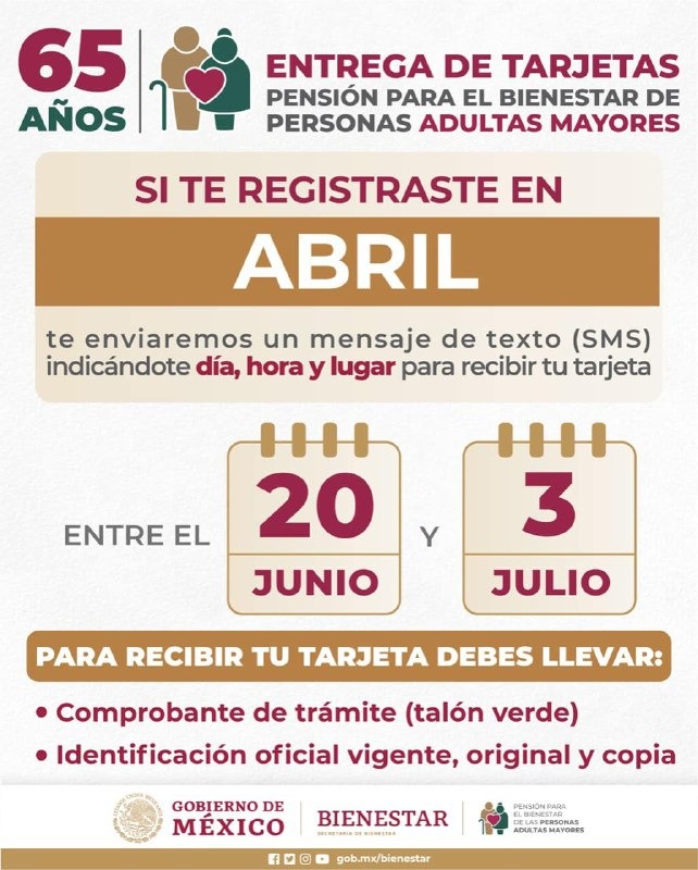 El Gobierno de México, a través de la Secretaría de Bienestar, informa que del 20 de junio al 3 de julio recibirán la tarjeta del Banco del Bienestar quienes se registraron a la Pensión para el Bienestar de las Personas Adultas Mayores en el mes de abril. La convocatoria se realizará a través de un mensaje de texto (SMS) al teléfono celular registrado en el trámite, para informar el día, la hora y el lugar donde recibirán su tarjeta bancaria. Es importante recordar que deberán llevar su comprobante de registro…