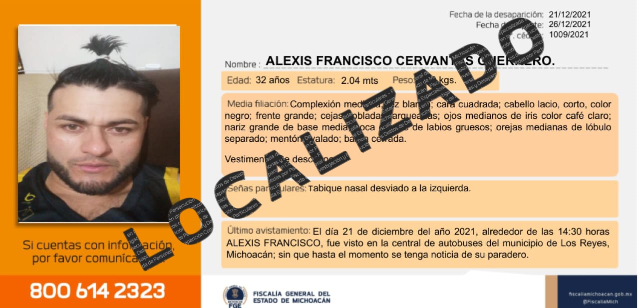 Alexis Cervantes, basquetbolista de la Liga Nacional de Baloncesto Profesional de México (LNBP) desaparecido desde el pasado 21 de diciembre en el municipio de Los Reyes, Michoacán, fue localizado con vida, informó el fiscal de ese estado, Adrián López Solís. Señaló que como resultado de un operativo interinstitucional encabezado por la Fiscalía fue localizado el deportista y también el taxista que lo trasladaba a su destino, Marcos Sandoval Julián. Hasta el momento se espera que las autoridades den más detalles de estas acciones.
