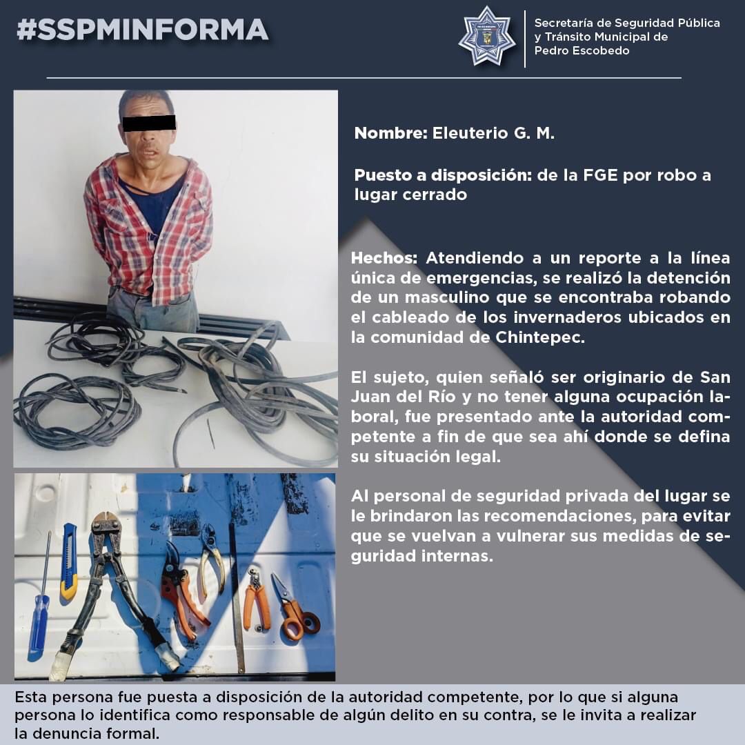 Un sujeto fue detenido por robar cableado de un invernadero en Pedro Escobedo