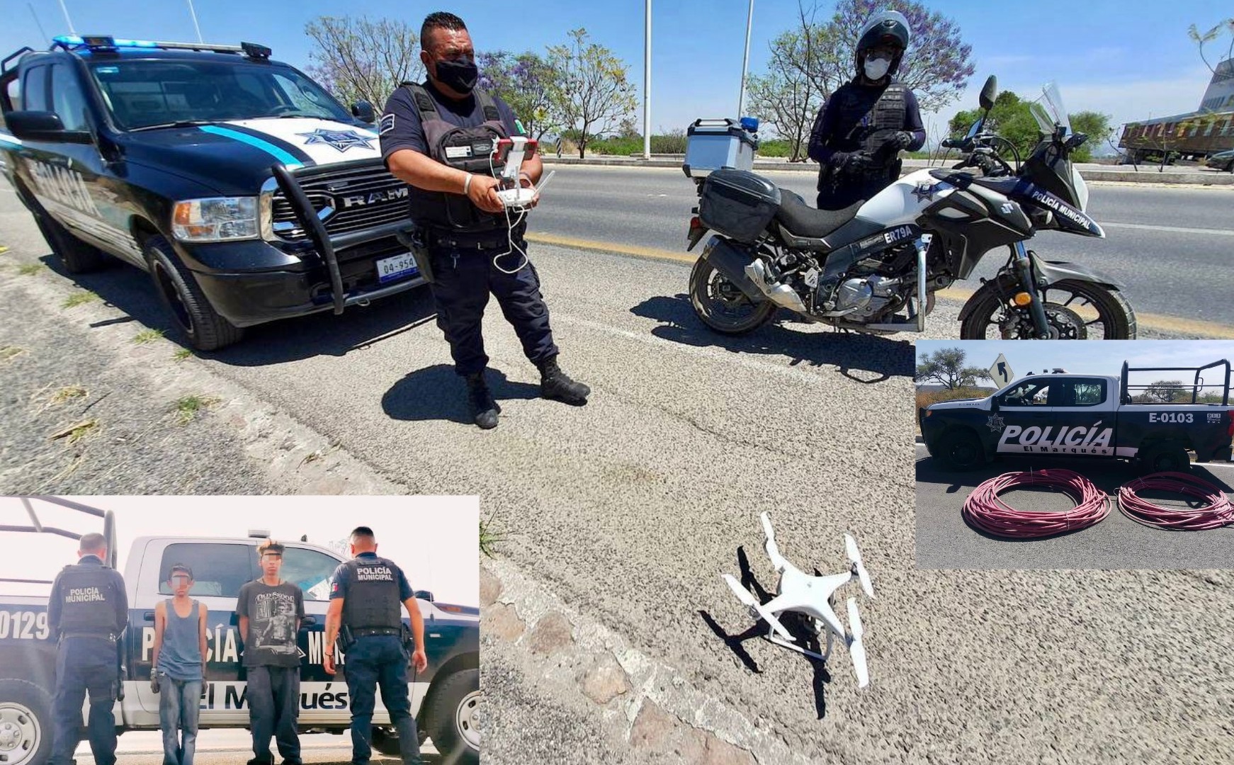 Dos masculinos que intentaban sustraer cable de cobre a la altura del Circuito Universidades, fueron detenidos gracias a la acción inmediata del personal operativo de la Secretaría de Seguridad Pública y Tránsito Municipal (SSPYTM) de El Marqués; derivado de las estrategias preventivas, y el uso de la tecnología a través de drones. Los detenidos son José Manuel “N”originario del Estado de México y Edwin “N” originario de Amealco, a quienes se les encontró un arma blanca; quienes al observar las unidades intentaron huir, por lo que se procedió a darles…
