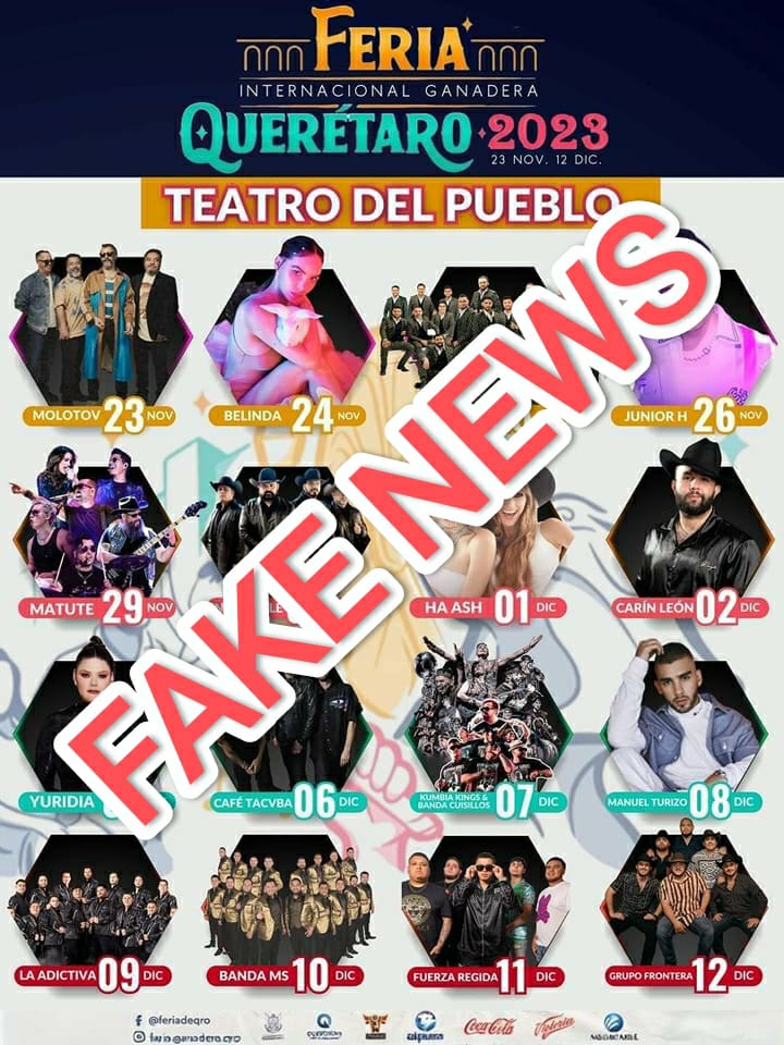 Alertan al público sobre la difusión de información falsa y destacan la importancia de esperar el anuncio oficial Los organizadores de la esperada Feria Internacional Ganadera Querétaro 2023 han emitido un comunicado oficial en el que desmienten categóricamente la autenticidad del cartel de artistas que recientemente ha circulado en redes sociales. Según la declaración, los artistas y las fechas anunciadas en dicho cartel no son verídicos. La advertencia se hizo a través de un comunicado de prensa en el que se instala al público en general a no dejarse engañar…
