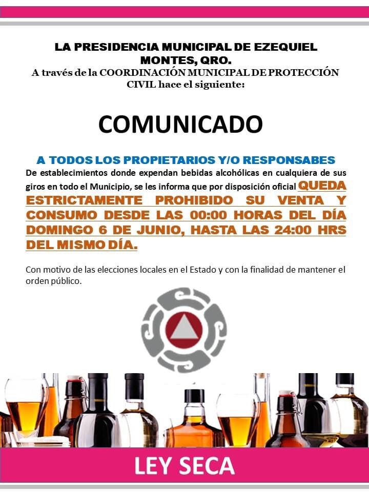 Los municipios de Pinal de Amoles, Jalpan de Serra, San Joaquín y Ezequiel Montes anunciaron que se aplicara la Ley Seca este 6 de junio Anunciaron que no habrá venta de bebidas alcohólicas de las 00:00 a las 24:00 horas, con la intención de que la jornada electoral se lleve en un ambiente de tranquilidad. En caso de que se incumpla con esta restricción, los establecimientos serán sancionados por parte de los municipios y el estado. Recordar que las autoridades estatales informaron que no aplicaría la restricción de bebidas alcohólicas,…