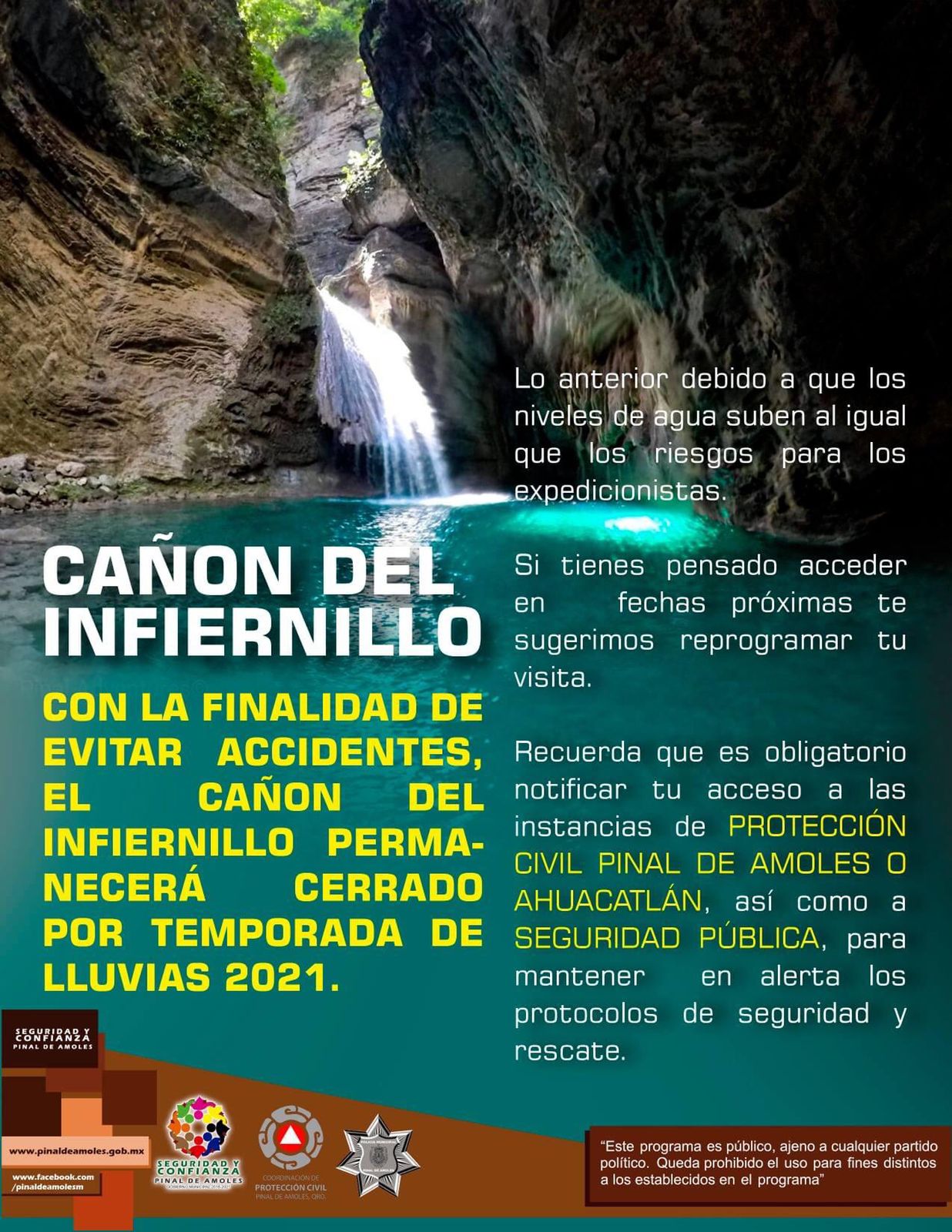 Ante la presencia de lluvias en la zona serrana, autoridades estatales confirmaron que algunos municipios decidieron cerrar al público varios puntos turísticos naturales, por lo que piden que antes de viajar realicen reservación. El secretario de turismo, Hugo Burgos, aseguró que lugares como el Río Escanela, Cañón del Infiernillo, Río Extoraz y Las Adjuntas se encuentran cerradas por la creciente del agua. “Claro desde luego estaremos poniendo en la página de Querétaro Travel todos los espacios, obviamente hablando con las autoridades de cada municipio con los directores que tenemos muchas…