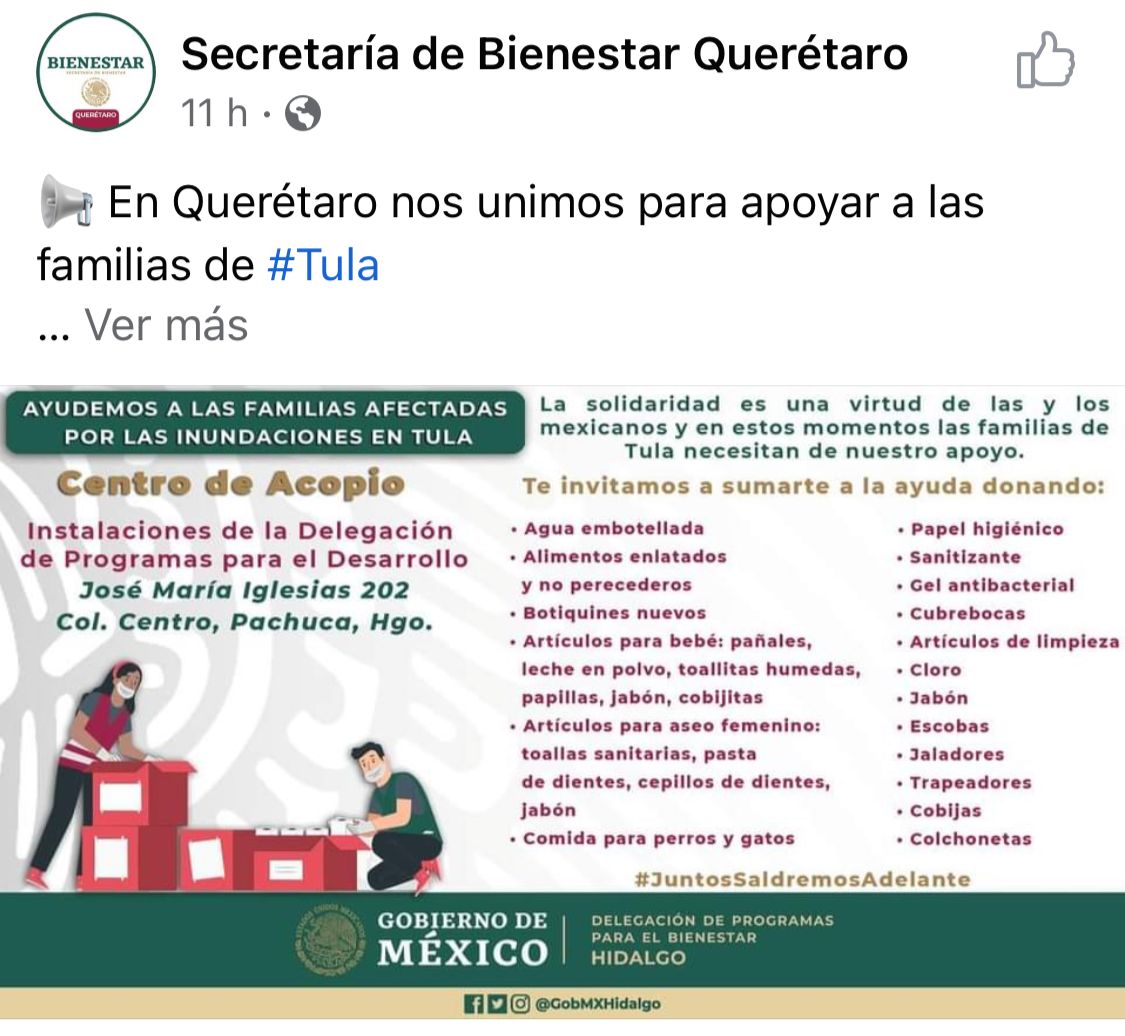 La delegación de la Secretaría del Bienestar en Querétaro se convirtió en un centro de acopio para apoyar a los damnificados de Tula, Hidalgo. Se invitó a la población a sumarse a este esfuerzo para llevar apoyo a los habitantes que perdieron todo a consecuencia de las fuertes lluvias de los días pasados. Las oficinas se ubican en Avenida Estadio #106 colonia Centro Sur. Puede donar agua embotellada, alimentos enlatados y no perecederos, botiquines nuevos, artículos para bebé, artículos para aseo femenino, comidas para perros y gatos, papel higiénico, sanitizante,…