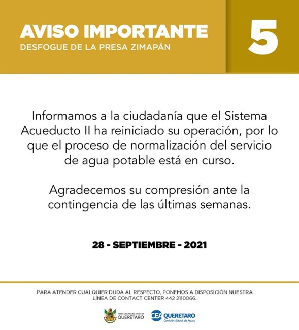 La Comisión Estatal de Aguas (CEA) informó que el sistema de Acueducto II ha reiniciado su operación, con lo cual comenzará a normalizarse el servicio de abastecimiento de agua potable. Cabe desctacar que la CEA detuvo la operación del Acueducto II debido a que la CFE inició el desfoge de la presa Zimapán, luego de encontrarse al 100 por ciento de su capacidad. La detención de operaciones del Acueducto afectó a la población de algunas zonas del estado, debido a que se registró servicio irregular de abastecimiento de agua potable.