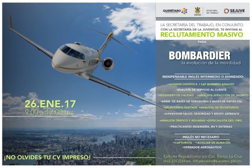 El próximo 26 de enero se llevará a cabo un reclutamiento masivo con la empresa Bombardier a fin de acercar oportunidades de empleo a los jóvenes del estado, que les permita incrementar su competitividad y crecimiento profesional. Este es el tercer reclutamiento que en conjunto organizan la Secretaría de la Juventud (SEJUVE) y la Secretaría del Trabajo (ST), el cual tendrá lugar en Ejército Republicano S/N Col. Barrio de la Cruz, para mayores informes comunicarse al teléfono (442) 224 22 54 Ext. 109. Las vacantes que se ofertarán y para…
