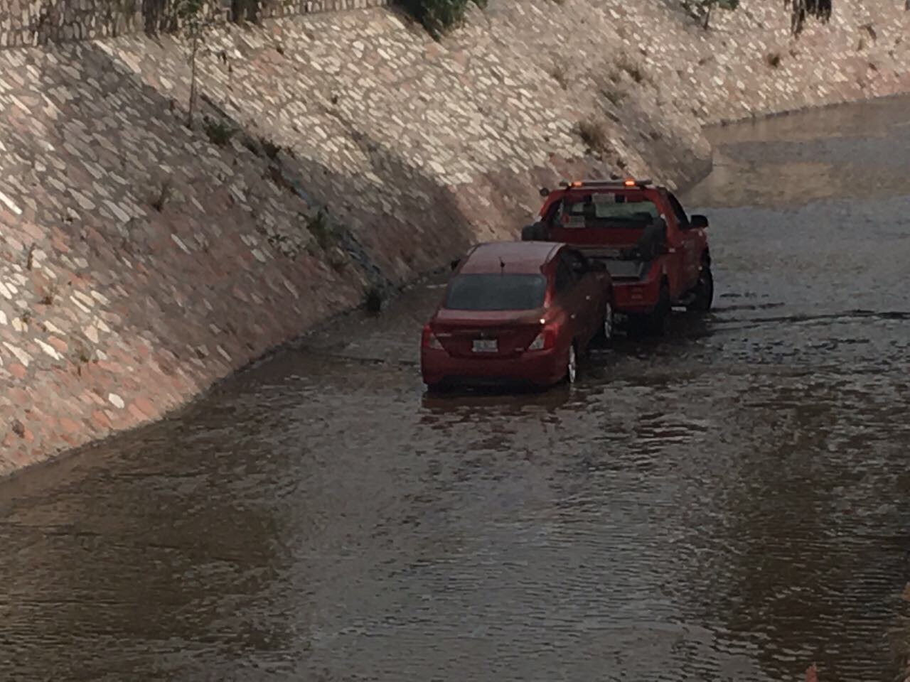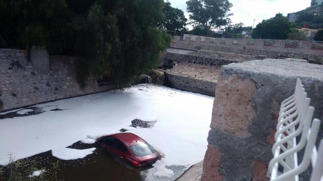 Un automóvil quedó inservible luego de que el conductor se metió al río Querétaro a circular en las inmediaciones del seminario de Querétaro, en determinado momento el agua le llegó a más de la mitad de la carrocería y ya no pudo moverse.