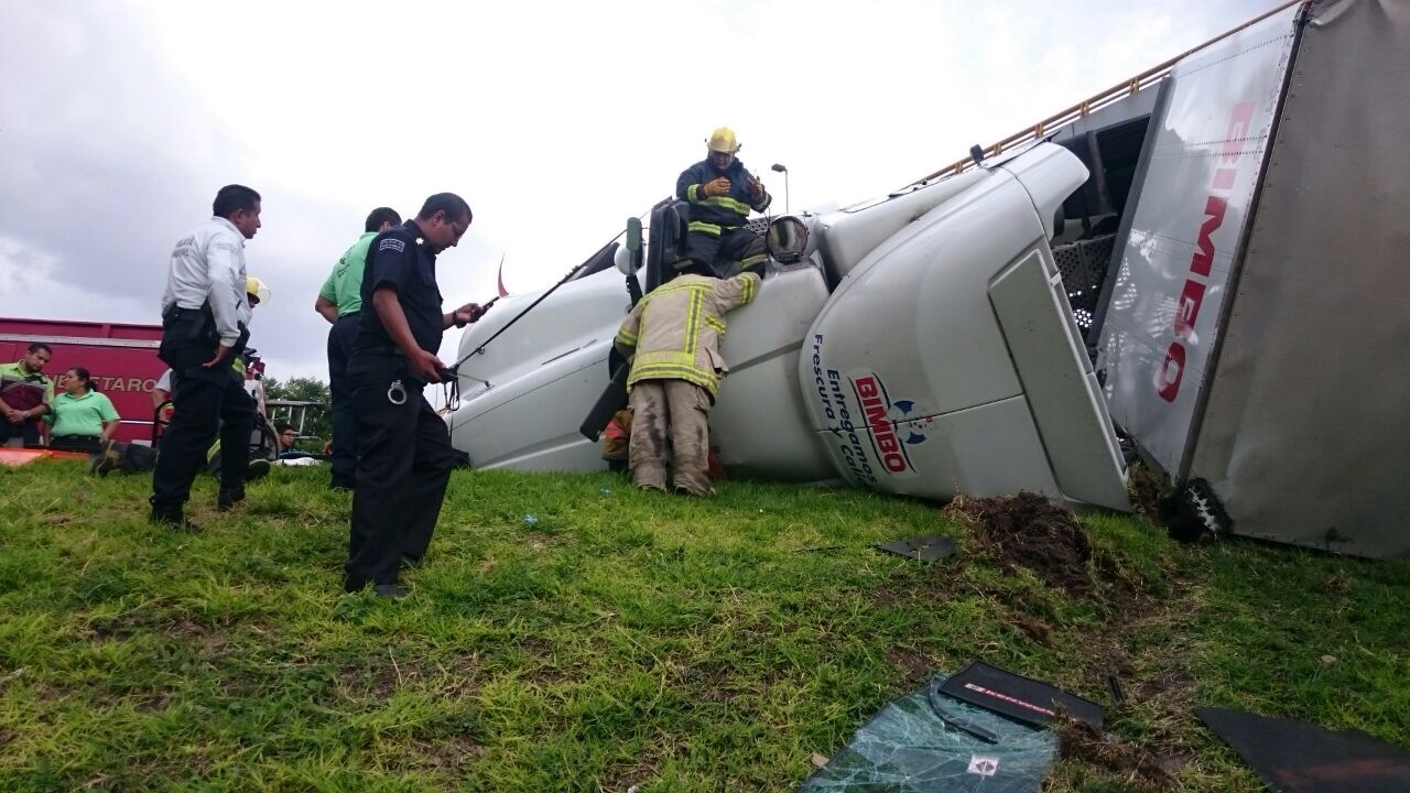 Brutal accidente ocurrido en el cruce de la Avenida 5 de febrero y el Boulevard bernardo quintana dejo atrapado al chófer más de una hora en la cabina del tractocamión. El incidente se derivó del exceso de velocidad a la hora de tomar el trébol.
