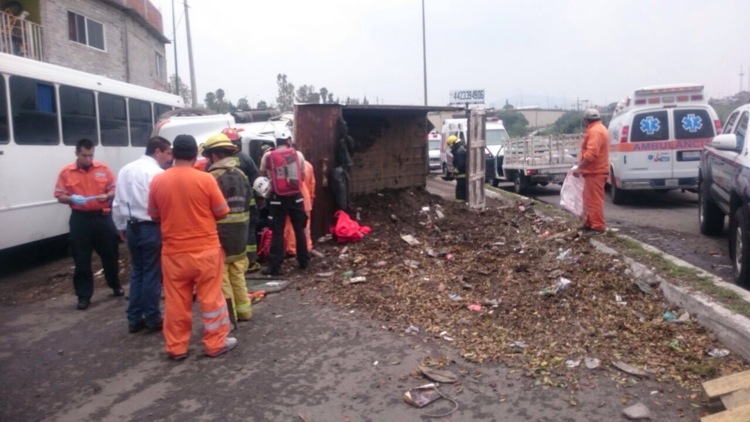 El hecho se dio en dirección al Paseo Constituyentes, justo al pasar una curva, donde la unidad quedó sobre su lado izquierdo y como consecuencia el chofer del volteo quedó atrapado en la carrocería.