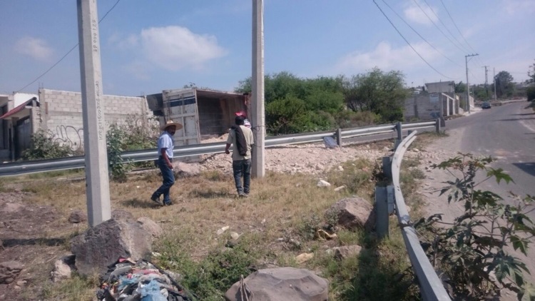 Un camión pesado acabó recostado sobre su lado izquierdo en una cuchilla de intersección de la Carretera a Chichimequillas y el anillo vial Fray Junípero Serra .