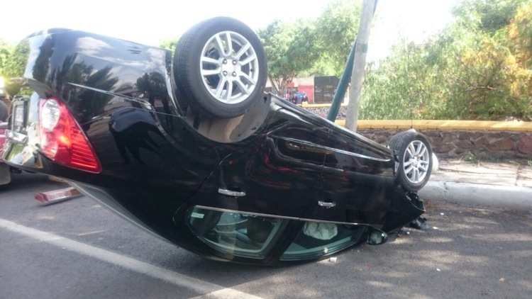 Aparatosa volcadura en el Avenida Universidad dejó daños materiales importantes en un automóvil modelo 2016, mismo que quedó llantas al cielo luego de que la conductora perdió el control y se fue directo contra un poste.